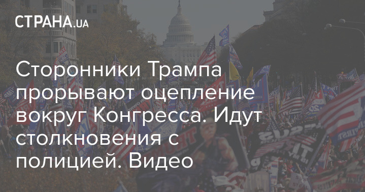 На кадрах видно, как толпа американцев в кепках республиканцев и с флагами пробиваются по лестнице у здания Конгресса. Полиция вынуждена отступать.