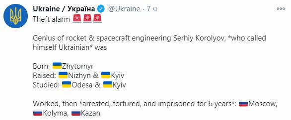 Правда, украинский аккаунт, описывая образовательную биографию Королева, забыл, что из Киевского политехнического института будущий ученый сам перевелся в московское высшее техучилище имени Баумана. Что, по нынешним украинским меркам, тянет на серьезную "зраду".