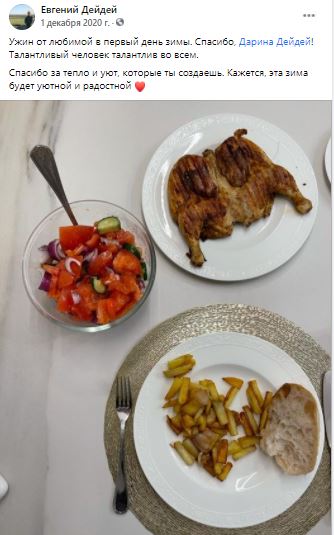 "Ужин от любимой в первый день зимы. Спасибо, Дарина Дейдей! Талантливый человек талантлив во всем. Спасибо за тепло и уют, которые ты создаешь. Кажется, эта зима будет уютной и радостной" - писал экс-нардеп.