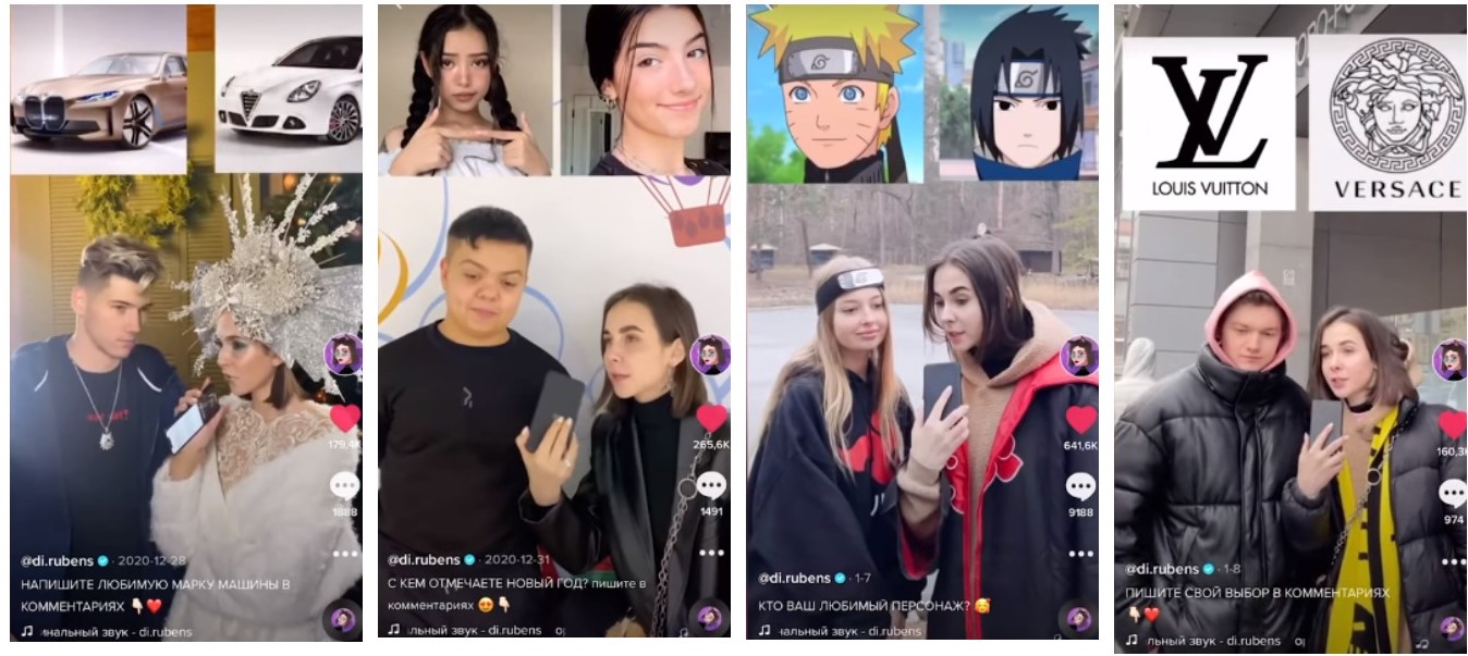 Она популярно объяснила о блогерском формате коллабораций, который стал особенно популярным для блиц-опросов TikTok (например, BMW или Alfa Romeo, Белла Порч или Чарли, Наруто или Саске, Louis Vuitton или Versace). Ее же вопрос звучал: "Какую страну ты бы хотела посетить?".