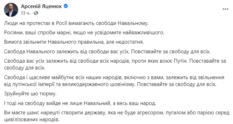 "Люди на протестах в России требуют свободы Навальному. Россияне, ваши попытки тщетны, если не осознаете главного.