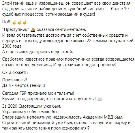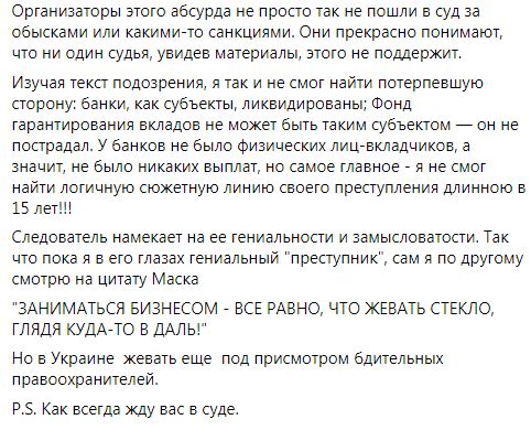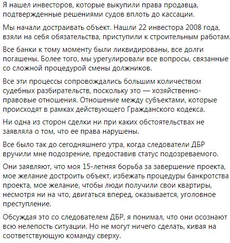 "Все было так до сегодняшнего утра, когда следователи ГБР вручили мне подозрение, предоставив статус подозреваемого. Обсуждая это со следователем ГБР, я понимал, что они осознают всю нелепость ситуации. Но не могут ничего сделать, кивая на соответствующую команду сверху", — говорит Андрей Ваврыш.