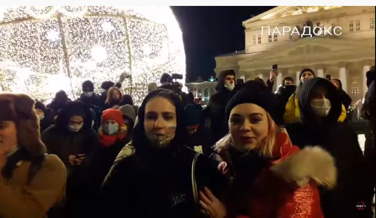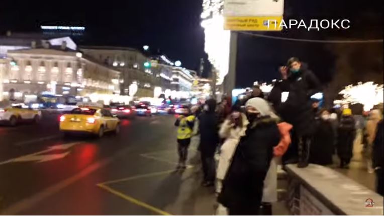 21:20 Собравшиеся напротив Большого театра машут сигналящим машинам.