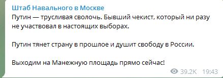 19:42 "Путин — трусливая сволочь. Бывший чекист, который ни разу не участвовал в настоящих выборах. Путин тянет страну в прошлое и душит свободу в России. Выходим на Манежную площадь прямо сейчас!" - написал Штаб Навального в Москве.