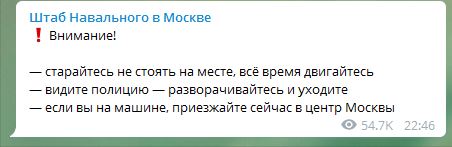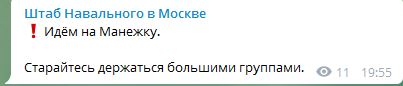 19:56 "Идем на Манежку. Старайтесь держаться большими группам" - призывает Штаб Навального в Москве.