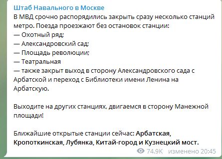 20:52 В Штабе Навального призвали москвичей выходить на тех станциях метро, которые еще открыты, и двигаться к Манежной площади.