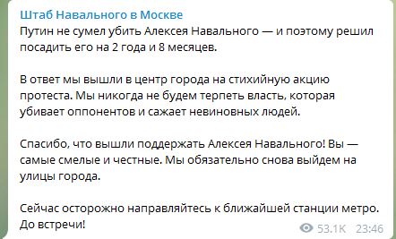 21:21 "Мы будем наращивать давление на Путина — как изнутри страны, так и снаружи — чтобы добиться освобождения Алексея Навального и всех политических заключенных. Будут выходить новые расследования. Будут проводиться новые мирные митинги и шествия. Будут достигаться новые победы на выборах." - пишет Штаб Навального в Москве.