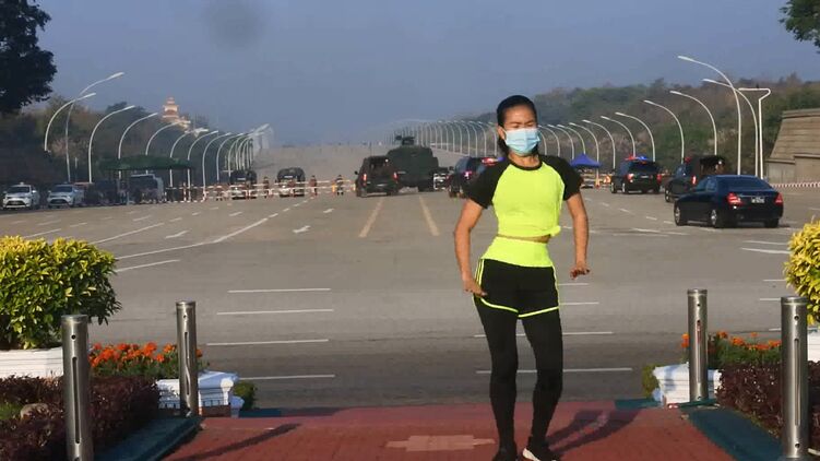 Una mujer hizo su clase de aerobic sin darse cuenta de que estaban dando el golpe de Estado en Myanmar. Y pues puede verse como el convoy de militares llega al parlamento. pic.twitter.com/fmFUzhawRe