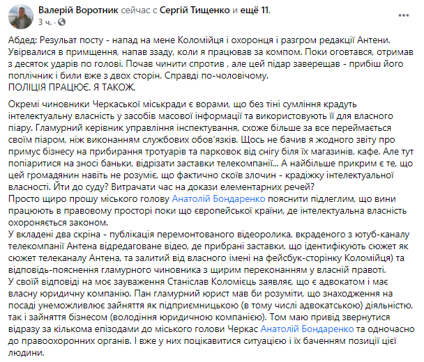 В свою очередь сам пострадавший журналист на своей странице в соцсети сообщил подробности нападения. По его словам в редакцию ворвался начальник управления инспекции Черкасского горсовета Станислав Коломиец и его подручный.