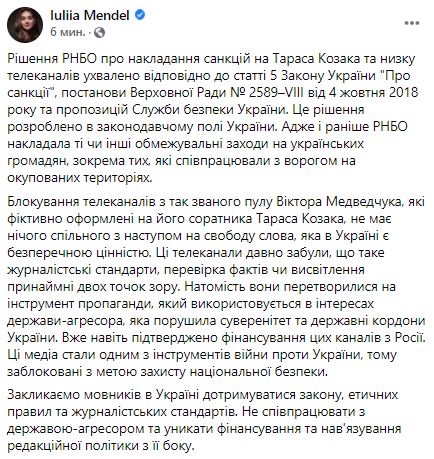 "Блокировка телеканалов так называемого пула Виктора Медведчука, которые фиктивно оформлены на его соратника Тараса Козака, не имеет ничего общего с наступлением на свободу слова, которая в Украине является несомненным ценностью. Эти телеканалы давно забыли, что такое журналистские стандарты, проверка фактов или освещения по крайней мере двух точек зрения. Вместо этого они превратились в инструмент пропаганды, который используется в интересах государства-агрессора, нарушившего суверенитет и государственные границы Украины. Уже даже подтверждено финансирование этих каналов из России. Эти медиа стали одним из инструментов войны против Украины, поэтому заблокированы с целью защиты национальной безопасности"- написала Мендель.