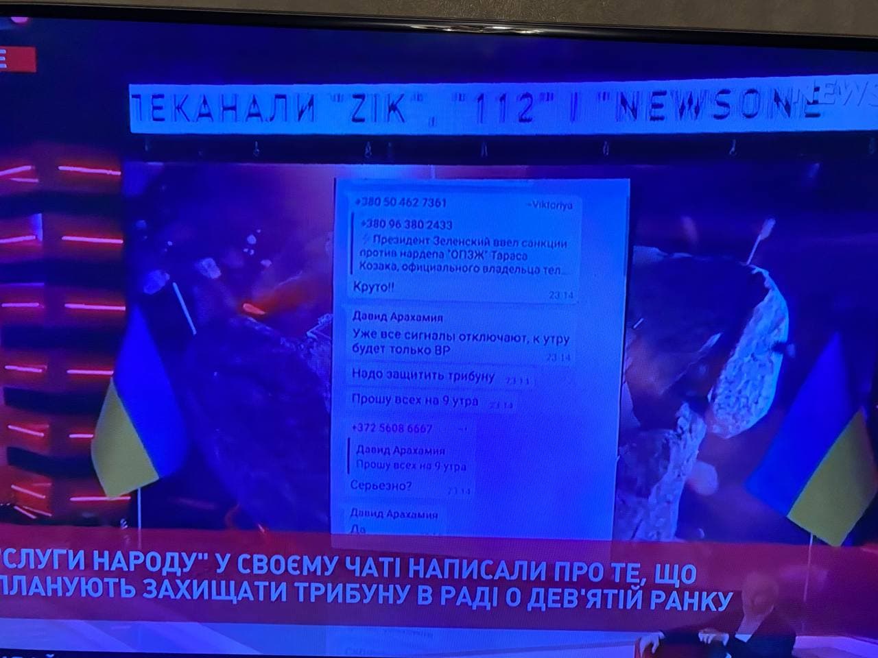 08:30 В эфире отключенных от вещания каналов (они теперь доступны только на YouTube) показывают внутреннюю переписку в чате "Слуг". Глава фракции Давид Арахамия пишет, что с утра нардепы ОПЗЖ готовятся блокировать трибуну.