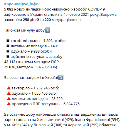 По состоянию на утро четверга, 4 февраля, количество зараженных коронавирусом в Украине увеличилось на 5 082 человека.
