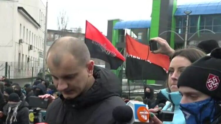 Сегодня под зданием телеканала "НАШ" прошла акция националистов, которые требовали закрытия вещателя. Одним из активных участников данного мероприятия был глава праворадикальной организации "Основа будущего" (бывшая "С14") Евгений Карась, который в какой-то момент принялся агрессивно оскорблять журналистов канала.