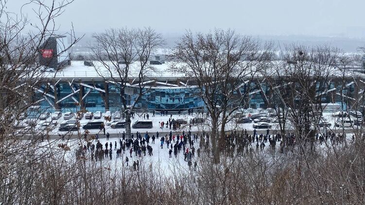 Протестующие выстроились в длинную цепь на Парковой аллее, что неподалеку от КВЦ "Парковый", где сегодня начался объявленный президентом Владимиром Зеленским форум-марафон по коронавирусу.