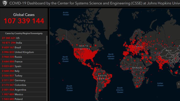 По данным на 11 февраля, число зараженных на Земле перевалило за 107 миллионов, фото: университет Дж. Хопкинса