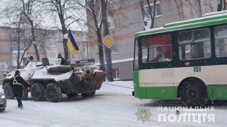В Ровно с помощью БТР вытащили троллейбус, который застрял в снегу, фото: Нацполиция