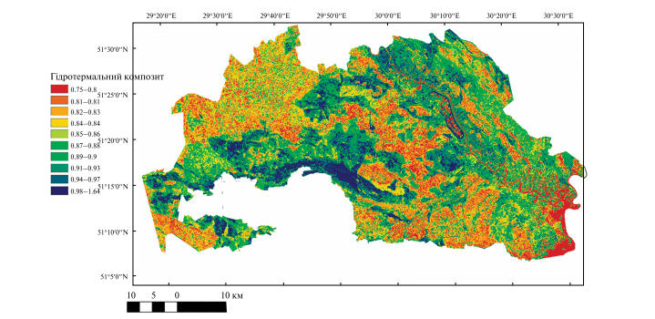 Скриншот: Карта гидротермального композита в пределах Чернобыльского биосферного радиационно-экологического заповедника по данным спутника "Landsat-8" от 24 апреля 2019.