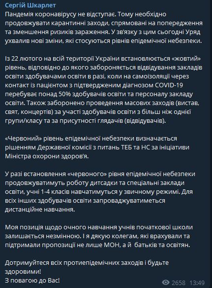 "Моя позиция по очному обучению учащихся начальной школы остается неизменной. И я благодарю коллег, которые учли и поддержали предложения не только МОН, но и родителей и педагогов", - написал Шкарлет.