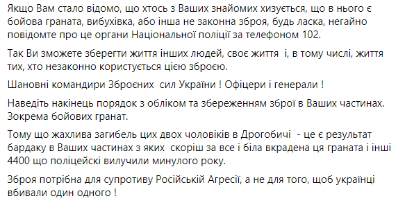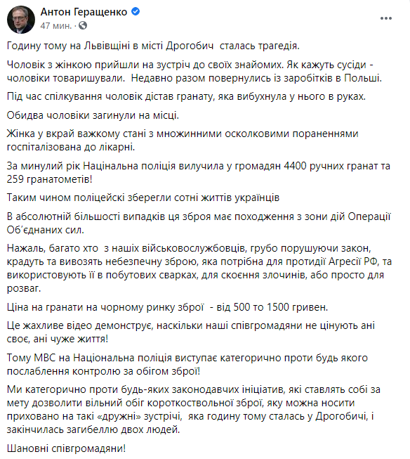 "Час назад на Львовщине, в городе Дрогобыч, произошла трагедия. Мужчина с женщиной пришел на встречу к своим знакомым. Во время общения мужчина достал ручную гранату, которая взорвалась в его руках. Двое мужчин погибли на месте", - заявил Геращенко.