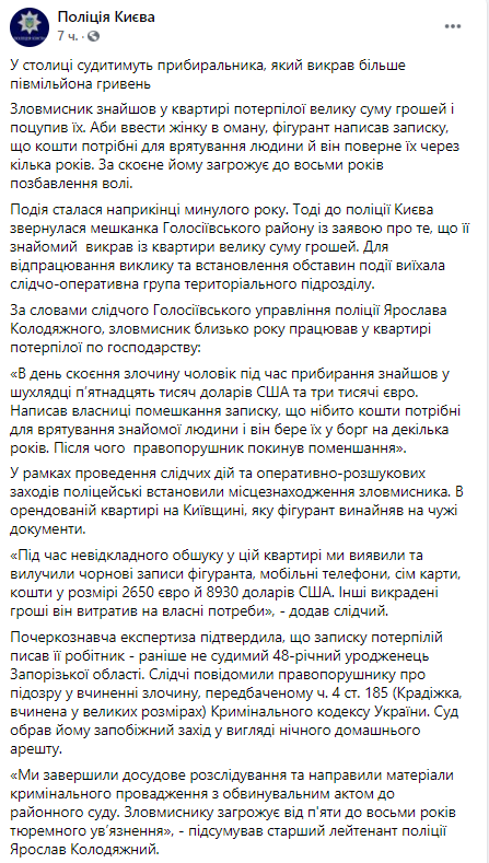 В Киеве будут судить уборщика, который украл деньги. Скриншот facebook.com/UA.KyivPolice
