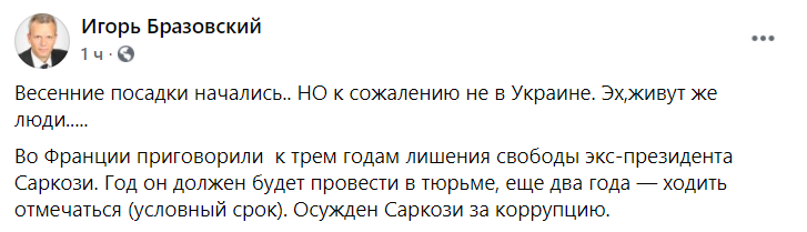 "Весенние посадки начались. Но, к сожалению, не в Украине. Эх, живут же люди", - пишет член наблюдательного совета Нацсоюза художников Игорь Бразовский.