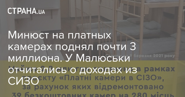 "На данный момент 2,9 млн гривен нам принес проект платных камер в СИЗО. Сейчас деньги с него идут только на одно – ремонт бесплатных камер СИЗО. В будущем часть из них будет идти также на поддержку состояния платных камер, если, например, в них что-либо поломается. Мы отремонтировали уже 39 бесплатных камер СИЗО на 280 мест. Количество платных камер растет, в мае у нас откроется новая партия платных камер в Киеве. На данный момент в Украине функционирует уже 36 платных камер в 26 следственных изоляторах", - заявил "Стране" Денис Малюська.