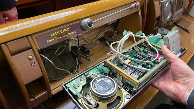 На кадрах видно, как из пульта для голосования, который вскрывает один из нардепов, валит дым. После этого спикер парламента Дмитрий Разумков объявил перерыв на 15 минут, чтобы проветрить зал заседаний.