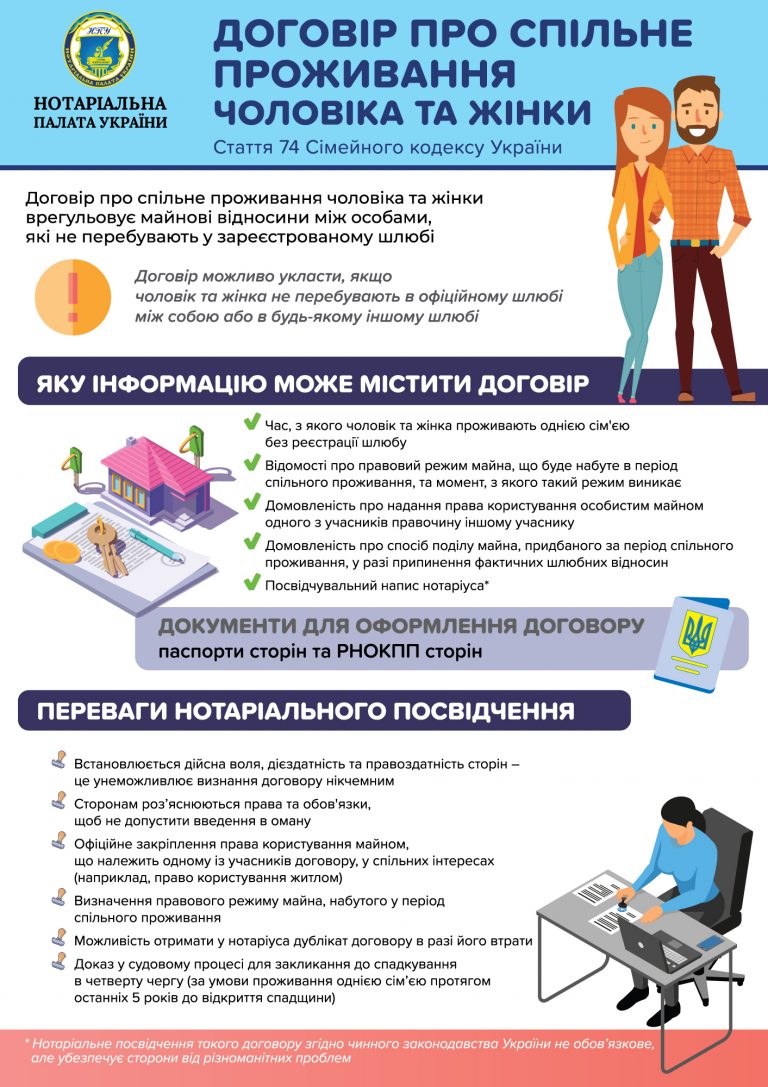 Нотариальная палата Украины в рамках проекта "Нотариат лицом к людям" подготовила инфографику о преимуществах нотариального удостоверения договора о совместном проживании мужчины и женщины.