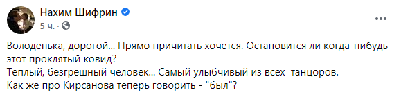 "Володенька, дорогой. Прямо причитать хочется. Остановится ли когда-нибудь этот проклятый ковид", - пишет актер.