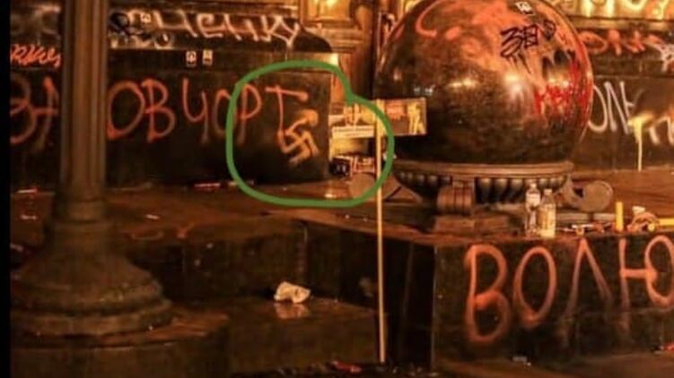 В ходе протестов возле здания Офиса президента в поддержку радикала Сергея Стерненко активисты разрисовали стены не только надписями и аббревиатурами, но и оставили после себя символ нацистской свастики.