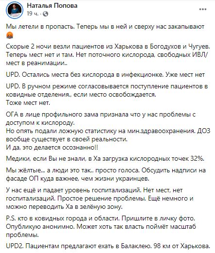 "У нас еще и падает уровень госпитализаций. Нет мест, нет госпитализаций. Простое решение проблемы. Ещё немного, и можно переводить Ха в зеленую зону" - написала Наталья Попова и посоветовала пациентам ехать в Балаклею в 98 км от Харькова.
