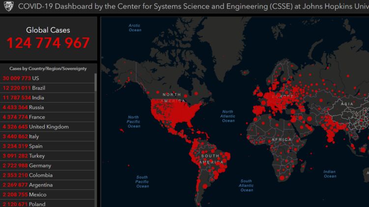 По данным на 25 марта число зараженных на Земле приближается к 125 миллионам, фото: arcgis.com