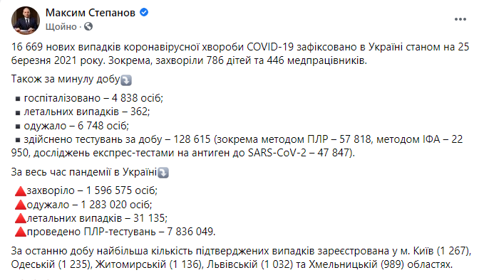 По состоянию на утро четверга, 25 марта, количество зараженных коронавирусом в Украине увеличилось на 16 669 человек.