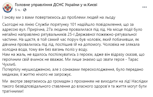 "Мужчину не испугала холодная вода, поэтому он без колебаний полез в воду. Нам к сожалению, не удалось пообщаться с героем, ведь он сразу сказал, что героическим свой поступок не считает. Мы только знаем, что зовут героя - Тарас Чухлиб", - рассказали спасатели.