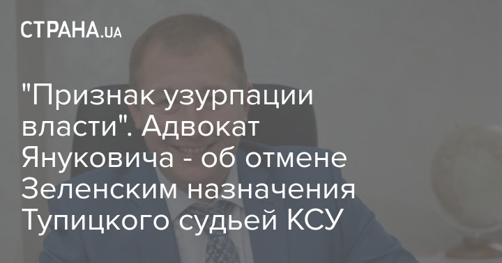 Адвокат экс-президента Виктора Януковича заявил о том, что отмена президентом Владимиром Зеленским указа Януковича о назначении Александра Тупицкого судьей КСУ является одним из признаков узурпации власти нынешним главой государства.
