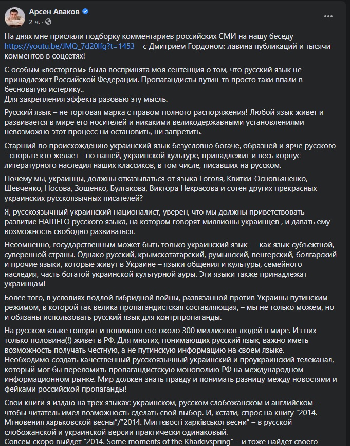 Аваков в посте называет себя украинским националистом, и соглашается, что государственным может быть только украинский, но настаивает, что другие языки тоже принадлежат украинцам.
