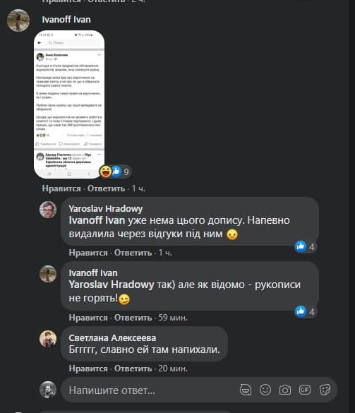 Теперь пользователи фейсбука атакуют пост Колесник за 26 марта (это снова самый "свежий" пост на странице автора). Там они делятся версиями о том, что же подтолкнуло Колесник удалить объяснения.
