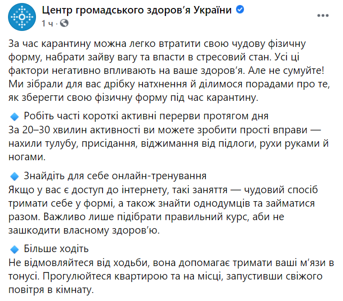 В МОЗ дали украинцам шесть советов, которые помогут сохранить физическую форму во время карантина