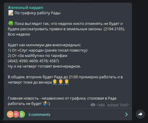 "В общем, вторник будет Рада до 21:00 примерно работать и в четверг тоже до вечера", - написал Железняк