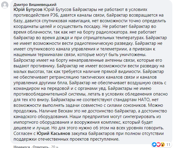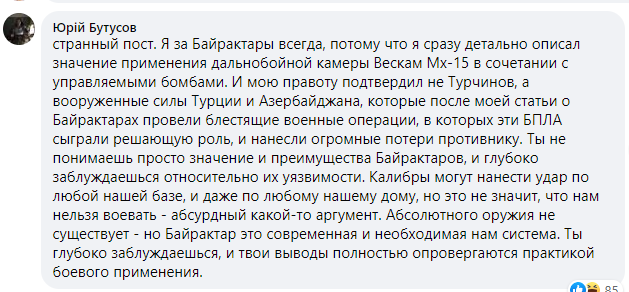 В комментариях у Касьянова начались споры. Упомянутый топикстартером главред "Цензора" Юрий Бутусов, который "топит" за применение "Байрактаров", заявил, что они отлично показали себя в Сирии и Карабахе. И могут бороться с российской ПВО.