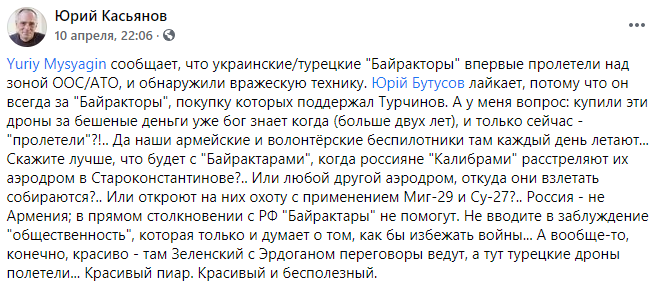 А вообще-то, конечно, красиво - там Зеленский с Эрдоганом переговоры ведут, а тут турецкие дроны полетели. Красивый пиар. Красивый и бесполезный", - написал Касьянов.