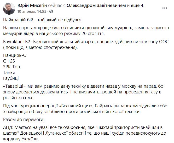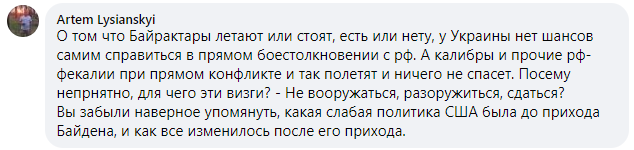 "О том, что Байрактары летают или стоят, есть или нету шансов самим справиться в прямом боестолкновении с РФ. А калибры и прочие рф-фекалии при прямом конфликте и так полетят и ничего не спасет. Посему непонятно, для чего эти визги? Не вооружаться, разоружиться, сдаться?".
