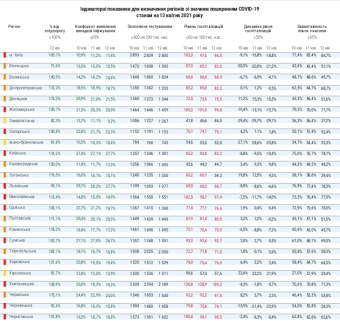 По состоянию на утро вторник, 13 апреля, в Украине сокращается уровень госпитализаций пациентов с Covid-19. Уже пять регионов соответствуют норме по этому показателю, в то время, как вчера было четыре. По сравнению с предыдущими сутками ситуация улучшилась в Луганской области.