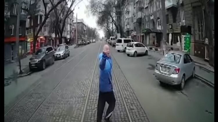 Во время бега мужчина умудрился еще показать водителю трамвая неприличный жест. Кадр с видео