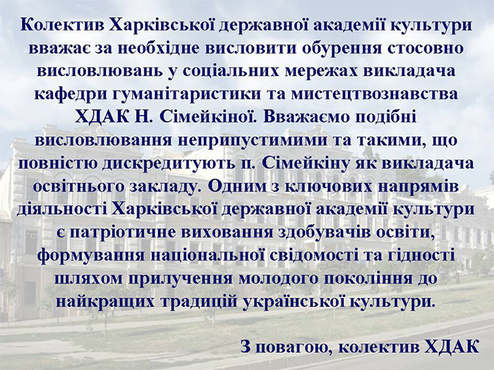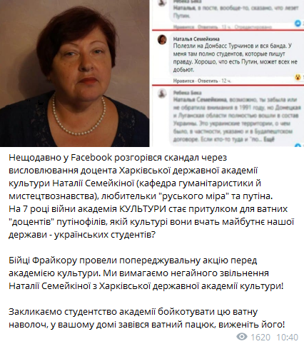 "Недавно в Facebook разгорелся скандал из-за высказываний доцента Харьковской государственной академии культуры Натальи Семейкиной (кафедра гуманитаристики и искусствоведения), любительницы "русского мира" и Путина.