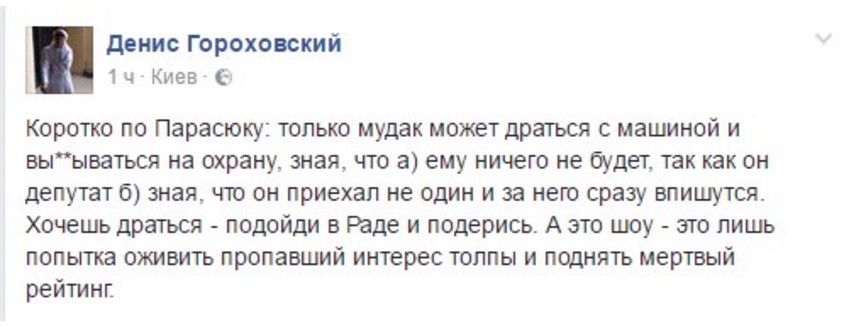 "Коротко по Парасюку: только м...к может драться с машиной и вы**ываться на охрану, зная, что а) ему ничего не будет, так как он депутат б) зная, что он приехал не один и за него сразу впишутся. Хочешь драться - подойди в Раде и подерись. А это шоу - это лишь попытка оживить пропавший интерес толпы и поднять мертвый рейтинг", - пишет на своей странице в соцсети Facebook Денис Гороховский.