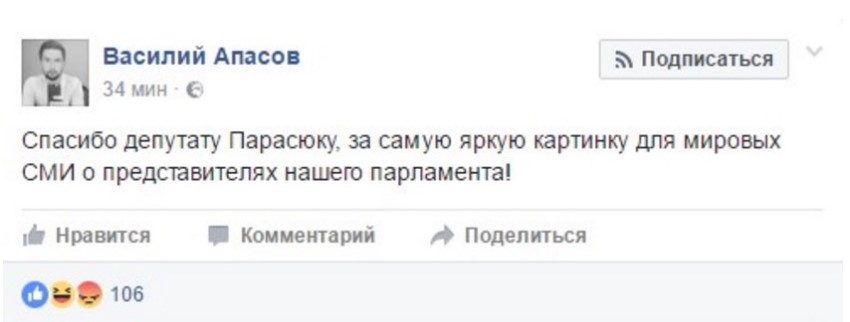 "Спасибо депутату Парасюку, за самую яркую картинку для мировых СМИ о представителях нашего парламента!", - написал Василий Апасов.