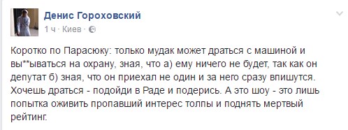"Коротко по Парасюку: только м...к может драться с машиной и вы**ываться на охрану, зная, что а) ему ничего не будет, так как он депутат б) зная, что он приехал не один и за него сразу впишутся. Хочешь драться - подойди в Раде и подерись. А это шоу - это лишь попытка оживить пропавший интерес толпы и поднять мертвый рейтинг", - пишет на своей странице в соцсети Facebook Денис Гороховский.