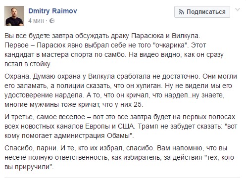 "Вы все будете завтра обсуждать драку Парасюка и Вилкула. Первое – Парасюк явно выбрал себе не того "очкарика". Этот кандидат в мастера спорта по самбо. На видео видно, как он сразу встал в стойку. Охрана. Думаю охрана у Вилкула сработала не достаточно. Они могли его заламать, а полиции сказать, что он хулиган. Ну не видели мы его удостоверение нардепа. А то, что он кричал, что нардеп..ну знаете, многие мужчины тоже кричат, что у них 25. И третье, самое веселое – вот это все завтра будет на первых полосах всех новостных каналов Европы и США. Трамп не забудет сказать: "вот кому помогает администрация Обамы". Спасибо, парни. И те, кто их избрал, спасибо. Вам напомню, что вы несете полную ответственность, как избиратель, за действия "тех, кого вы приручили"", - пишет Дмитрий Раимов на своей странице в Facebook.