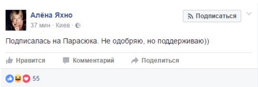 "Подписалась на Парасюка. Не одобряю, но поддерживаю))", - пишет в Facebook журналист Алёна Яхно.